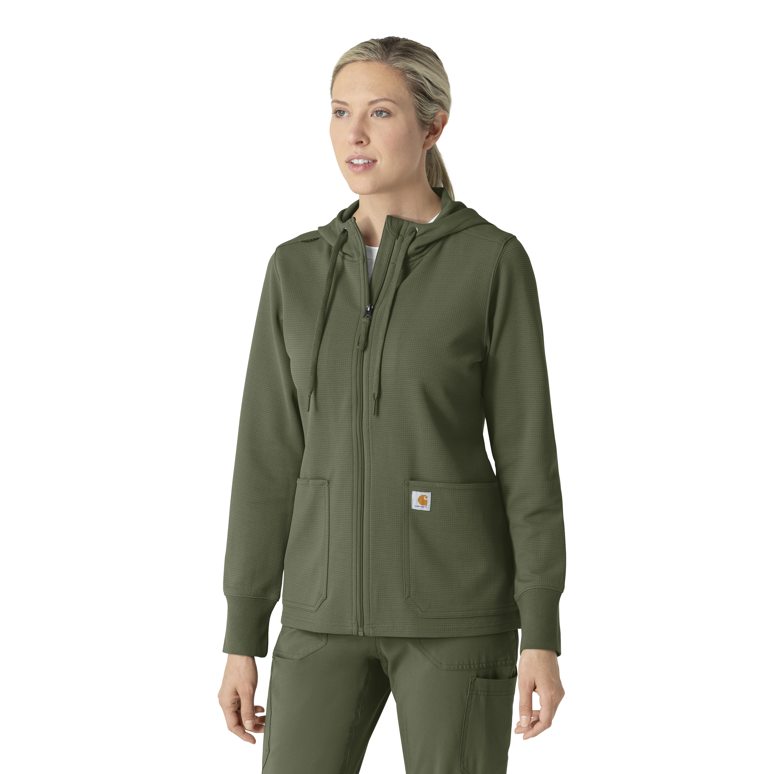 This women's Carhartt hoodie seamlessly blends the brand's signature casual style with the practical performance features essential for busy professionals. Crafted from a comfortable waffle-knit polyester fabric, it offers a soft yet durable layer for everyday wear. The full-zip design allows for easy on and off, providing versatile temperature control. Functionality is prioritized with an abundance of pockets, ensuring you have ample space for all your necessities. Notably, an internal stethoscope pocket keeps this crucial tool secure and readily accessible. The extra-long knit cuffs are designed to be compatible with gloves, providing a seamless and comfortable fit that eliminates gaps and enhances protection. A badge loop at the shoulder ensures your ID is clearly displayed, streamlining identification processes and enhancing workplace efficiency. This hoodie is more than just a casual garment; it's a carefully designed piece of performance wear built to meet the demands of your busy schedule while maintaining a comfortable and stylish appearance. It's the perfect combination of Carhartt's rugged durability and thoughtful design, making it an ideal choice for any healthcare professional seeking a reliable and functional hoodie. 100% Polyester Womens Zipper Modern Hoodie Chin guard, full zipper and shoulder badge loop Two top loading pockets with one pen slot, one internal stethoscope pocket Three piece hood with drawcord Long knit cuffs that stay put, making it easy to slide gloves over Soft waffle-knit polyester fabric Machine wash cold with like colors on gentle. Tumble dry on low. Promptly remove from dryer. Cool iron if needed. Avoid using bleach or harsh chemicals.