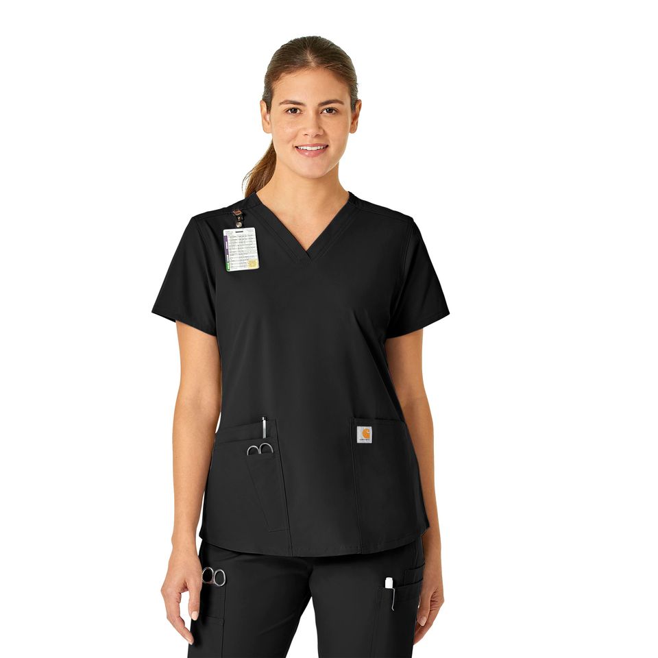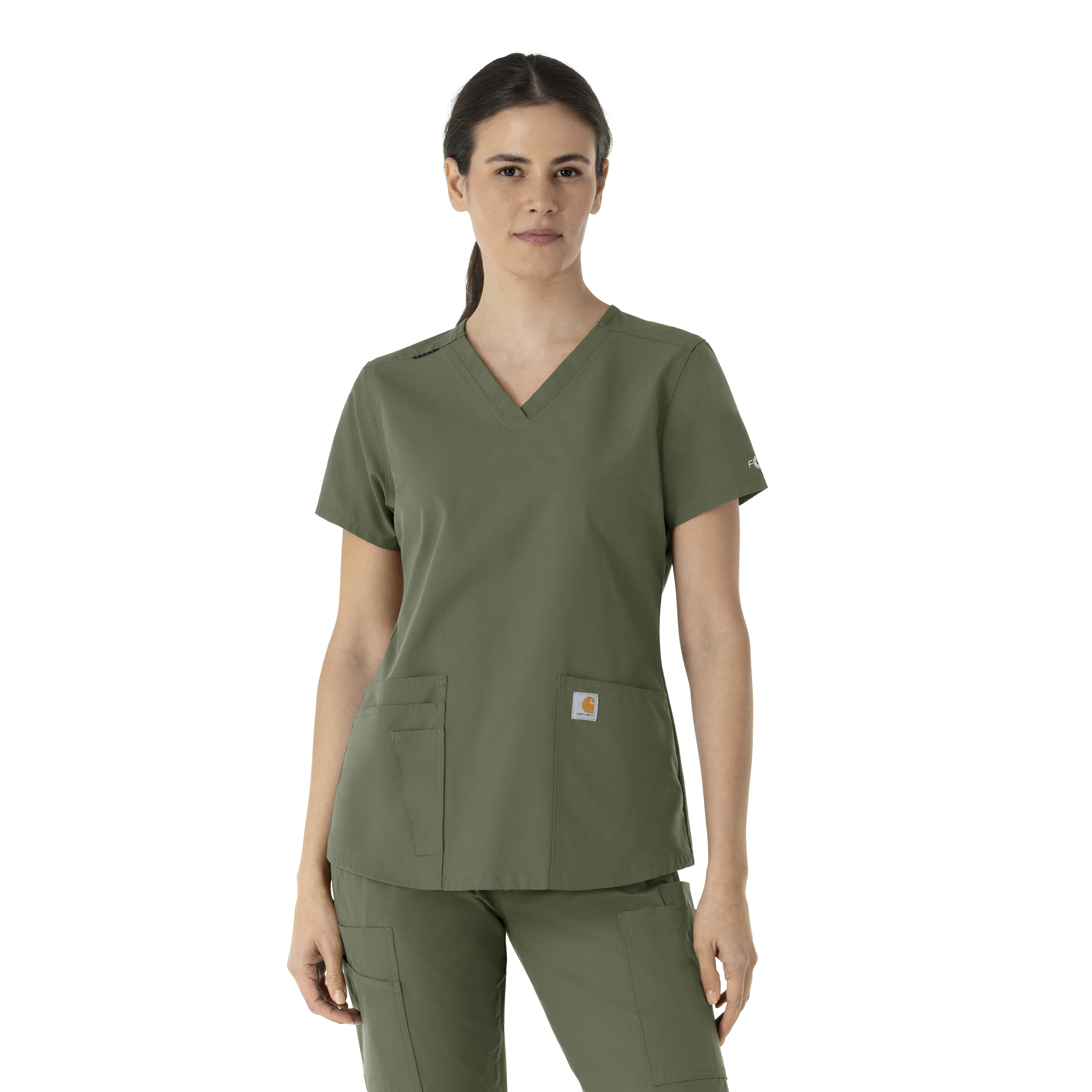 -- Ditch your outdated women’s scrubs and start every shift in comfort in the Carhartt Force Essentials 5-Pocket V-Neck Scrub Top. This stylish women’s scrub top is made with sustainable lightweight fabric and features the long trusted Carhartt Scrubs Rugged Flex Stretch Technology that provides unmatched comfort and durability. Designed for women who want a more tailored fit, this Carhartt top has a classic v-neckline along with back princess seaming and a shirttail hem to complete that tailored, feminine look. Your tools and personal accessories are essential, so we made sure to include functional features like a badge loop at the shoulder and easy to access front pockets with extra details like a hidden cell phone and scissor pocket. Hectic shift? No sweat; this scrub top is built with FastDry Technology that wicks moisture keeping you dry plus Stain Breaker Technology that helps release those inevitable stains before they set in.