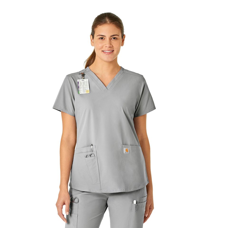 -- Ditch your outdated women’s scrubs and start every shift in comfort in the Carhartt Force Essentials 5-Pocket V-Neck Scrub Top. This stylish women’s scrub top is made with sustainable lightweight fabric and features the long trusted Carhartt Scrubs Rugged Flex Stretch Technology that provides unmatched comfort and durability. Designed for women who want a more tailored fit, this Carhartt top has a classic v-neckline along with back princess seaming and a shirttail hem to complete that tailored, feminine look. Your tools and personal accessories are essential, so we made sure to include functional features like a badge loop at the shoulder and easy to access front pockets with extra details like a hidden cell phone and scissor pocket. Hectic shift? No sweat; this scrub top is built with FastDry Technology that wicks moisture keeping you dry plus Stain Breaker Technology that helps release those inevitable stains before they set in.