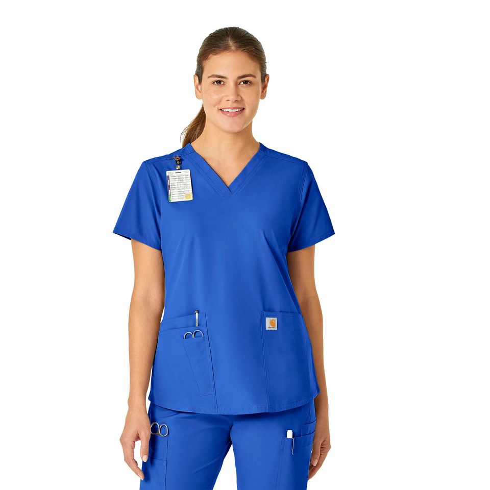 -- Ditch your outdated women’s scrubs and start every shift in comfort in the Carhartt Force Essentials 5-Pocket V-Neck Scrub Top. This stylish women’s scrub top is made with sustainable lightweight fabric and features the long trusted Carhartt Scrubs Rugged Flex Stretch Technology that provides unmatched comfort and durability. Designed for women who want a more tailored fit, this Carhartt top has a classic v-neckline along with back princess seaming and a shirttail hem to complete that tailored, feminine look. Your tools and personal accessories are essential, so we made sure to include functional features like a badge loop at the shoulder and easy to access front pockets with extra details like a hidden cell phone and scissor pocket. Hectic shift? No sweat; this scrub top is built with FastDry Technology that wicks moisture keeping you dry plus Stain Breaker Technology that helps release those inevitable stains before they set in.