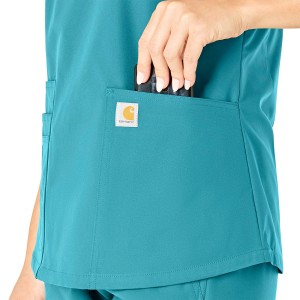 -- Ditch your outdated women’s scrubs and start every shift in comfort in the Carhartt Force Essentials 5-Pocket V-Neck Scrub Top. This stylish women’s scrub top is made with sustainable lightweight fabric and features the long trusted Carhartt Scrubs Rugged Flex Stretch Technology that provides unmatched comfort and durability. Designed for women who want a more tailored fit, this Carhartt top has a classic v-neckline along with back princess seaming and a shirttail hem to complete that tailored, feminine look. Your tools and personal accessories are essential, so we made sure to include functional features like a badge loop at the shoulder and easy to access front pockets with extra details like a hidden cell phone and scissor pocket. Hectic shift? No sweat; this scrub top is built with FastDry Technology that wicks moisture keeping you dry plus Stain Breaker Technology that helps release those inevitable stains before they set in.