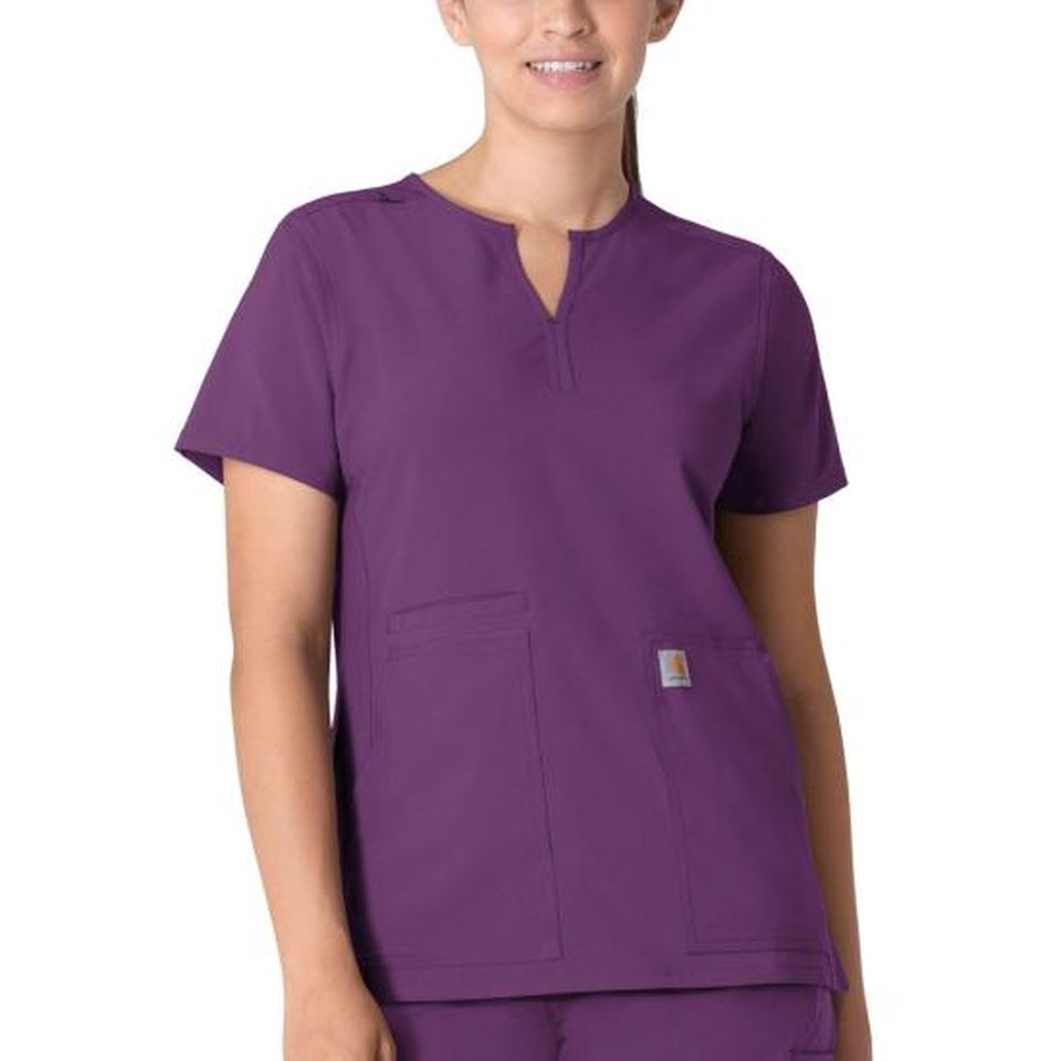 Blend style with function when wearing the Carhartt Force Essentials Women's Notch Neck Tunic Top. The notch neckline sits above the collar bone while the princess seaming gives this women’s scrub top a more tailored fit. The curved shirttail hemline not only adds style but length and along with the side hem vents sitting, bending, and reaching feels less restricted. Need pockets for your essentials? This stylish scrub top has large front patch side entry pockets with a besom seam hidden cell phone pocket. We know how tough shifts can get so we added FastDry technology along with Rugged Flex Stretch to provide moisture-wicking and an all-day comfortable fit. We know stains are inevitable but with Stain Breaker technology those stains are easily released giving you like new scrubs with every wear. 50% Recycled Polyester/50% Polyester Womens Pullover Modern Notch Neck Notch neckline that sits above the collar bone with badge ID loop along shoulder seam Large front patch side-entry pockets with hidden top loading cell phone pocket FastDry® technology keeps you cool for all day comfort, built to move with Rugged Flex® stretch technology, Stain Breaker® technology releases stains Princess seaming for a tailored fit, curved shirttail hemline for added style and side hem vents for ease of movement Lightweight, durable, sustainable and comfortable Ripstop fabric Carhartt Womens Scrub Top Notch Neck Carhartt Core C12213 Machine wash cold with like colors on gentle. Tumble dry on low. Promptly remove from dryer. Cool iron if needed. Avoid using bleach or harsh chemicals.