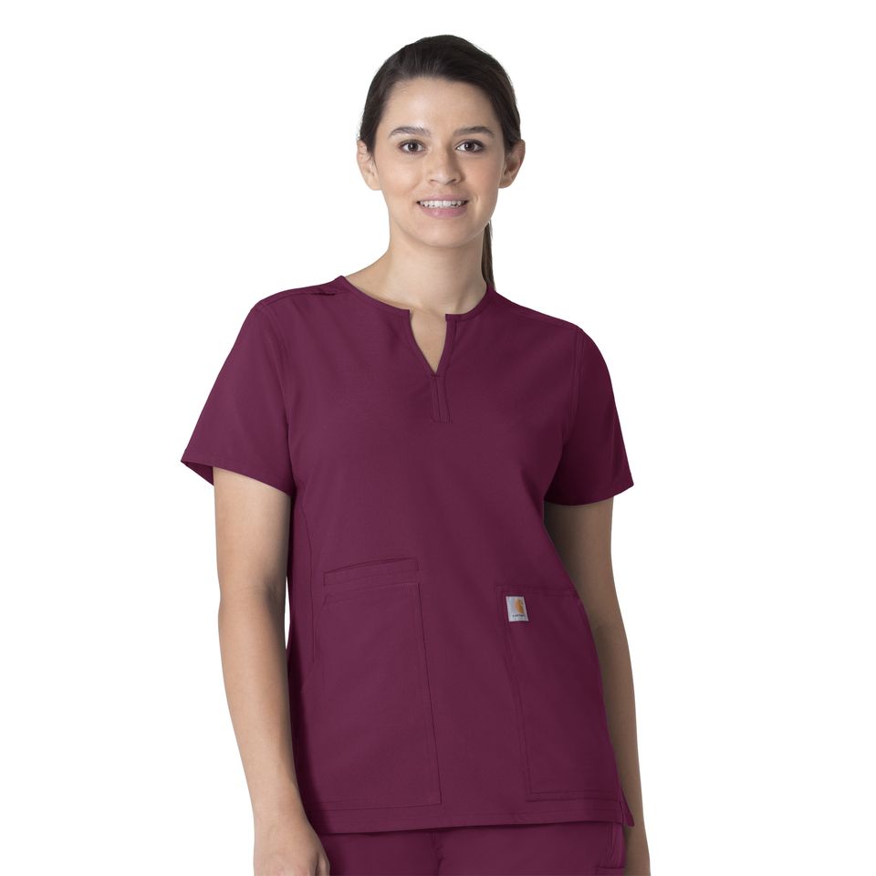 Blend style with function when wearing the Carhartt Force Essentials Women's Notch Neck Tunic Top. The notch neckline sits above the collar bone while the princess seaming gives this women’s scrub top a more tailored fit. The curved shirttail hemline not only adds style but length and along with the side hem vents sitting, bending, and reaching feels less restricted. Need pockets for your essentials? This stylish scrub top has large front patch side entry pockets with a besom seam hidden cell phone pocket. We know how tough shifts can get so we added FastDry technology along with Rugged Flex Stretch to provide moisture-wicking and an all-day comfortable fit. We know stains are inevitable but with Stain Breaker technology those stains are easily released giving you like new scrubs with every wear. 50% Recycled Polyester/50% Polyester Womens Pullover Modern Notch Neck Notch neckline that sits above the collar bone with badge ID loop along shoulder seam Large front patch side-entry pockets with hidden top loading cell phone pocket FastDry® technology keeps you cool for all day comfort, built to move with Rugged Flex® stretch technology, Stain Breaker® technology releases stains Princess seaming for a tailored fit, curved shirttail hemline for added style and side hem vents for ease of movement Lightweight, durable, sustainable and comfortable Ripstop fabric Carhartt Womens Scrub Top Notch Neck Carhartt Core C12213 Machine wash cold with like colors on gentle. Tumble dry on low. Promptly remove from dryer. Cool iron if needed. Avoid using bleach or harsh chemicals.