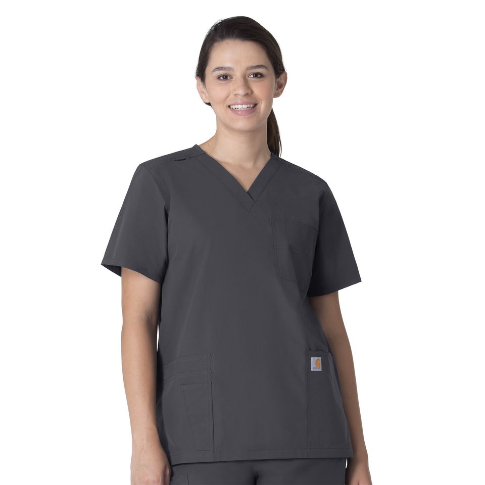 Finally, a pair of unisex scrubs with style! Carhartt Unisex Force Essentials V-Neck 6-Pocket Top is all that and more with its curved shirttail hemline and side hem vents that allow you to move comfortably. Like most unisex scrub tops this one features the classic v-neck style that allows more room around the neck. This scrub top provides you with much needed pocket space with a total of 6 pockets. Each pocket is the perfect size to hold you essential items including a chest pocket with pen slot, two large top loading patch pockets with hidden cell phone and scissor pockets in each. On the shoulder is a built-in badge loop so you can easily reach for your ID badge while on the go. And while you are on the go Carhartt Scrubs fabric technology is designed to keep you comfortable with FastDry technology that wicks moisture away from the body, Rugged Flex Stretch that allows ease of movement and Stain Breaker technology that releases those pesky stains. Carhartt unisex scrubs are a notch above the rest in style, comfort and functionality. 50% Recycled Polyester/50% Polyester Unisex Pullover Modern V-Neck V-Neck style with shoulder badge loop One chest pocket with pen slot, two large top loading patch pockets with an internal cell phone pocket at left and an internal scissor pocket at right FastDry® technology keeps you cool for all day comfort, built to move with Rugged Flex® stretch technology, Stain Breaker® technology releases stains Curved shirttail hemline and side hem vents Lightweight, durable, sustainable and comfortable Ripstop fabric Carhartt Unisex Scrub Top V-Neck Carhartt Core C15013 Machine wash cold with like colors on gentle. Tumble dry on low. Promptly remove from dryer. Cool iron if needed. Avoid using bleach or harsh chemicals.