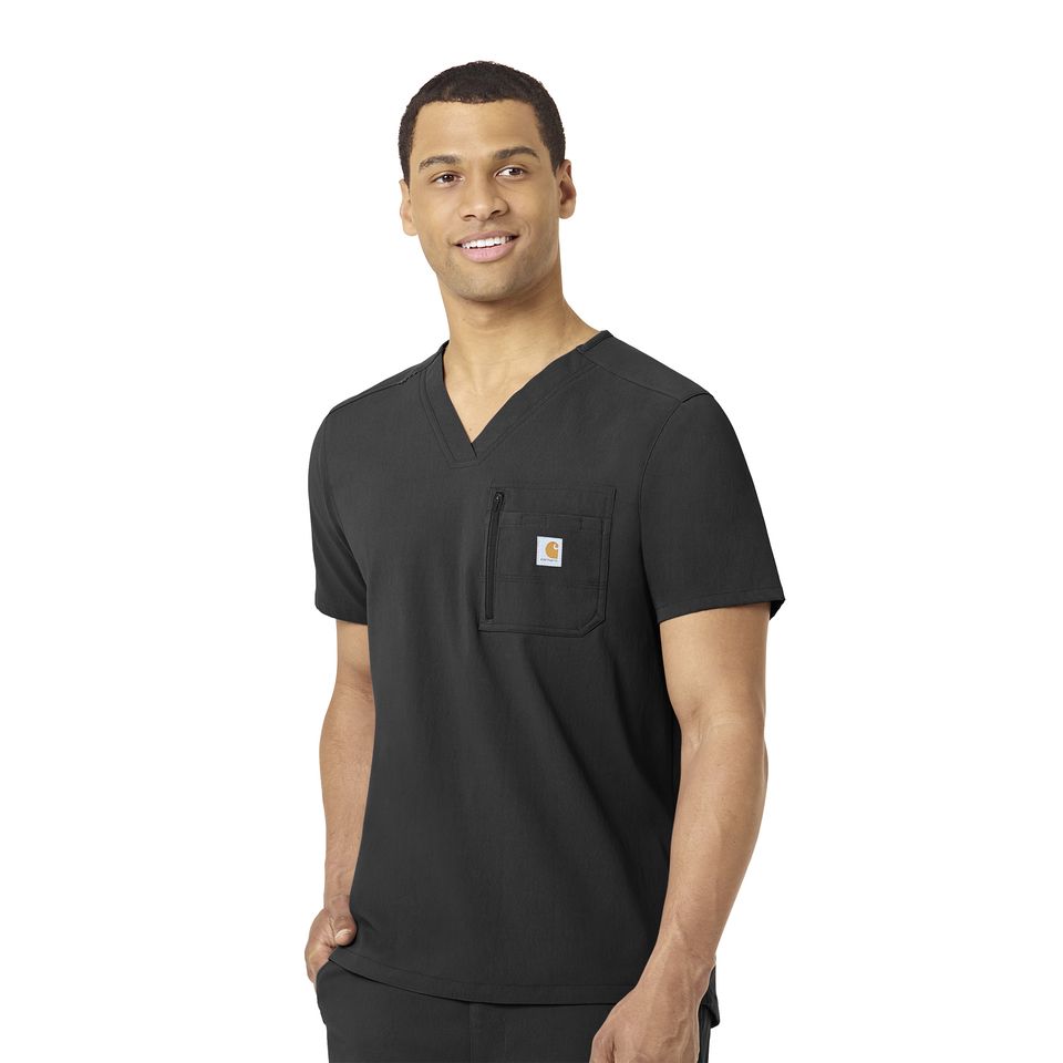 The Men’s Rugged Flex Peak Modern Fit Tuck-In Top is for the fashion forward guys that don’t want all of those extra pockets. This style is sleek and stylish featuring a triple left chest pocket that proudly features the Carhartt logo, offers a pen slot and two other small compartments that have hook and loop closure or a full zip to keep small valuables secure. The scrub top features a badge loop at the shoulder that “hides” if not in use, and a fashionable shirt-tail hem if you don’t want to wear the top tucked in. The triple-needle stitching along the shoulder yoke offers extra reinforcement and durability while the vented back mesh-lined panel offers even more comfort and breathability. The comfort, convenience, and durability of this Carhartt collection is unsurpassed manufactured with a nylon-spandex fabric blend treated with HEIQ ECO DRY technology. This technology treatment is an eco-friendly durable water repellency for your scrubs that allows fluids to bead up and roll off rather than absorbing into the fabric. The Nylon/Spandex fabric blend is long lasting performance fabric that moves with you, features the eco-friendly HIEQ ECO DRY, and offers a smooth and comfortable feel against your body. 96% Nylon/4% Spandex Mens Pullover Modern V-Neck Triple-needle stitching and badge ID loop at shoulder seams Triple-layer chest pocket with zipper and hook-and-loop closures, additional pen slot at chest pocket HeiQ ECO DRY technology for eco-friendly durable water repellency Vented back mesh-lined panels for breathability Lightweight and durable fabric with wicking, soil release and mechanical stretch Carhartt Mens Scrub Top V-Neck Peak C15137 Machine wash cold with like colors on gentle. Tumble dry on low. Promptly remove from dryer. Cool iron if needed. Avoid using bleach or harsh chemicals.