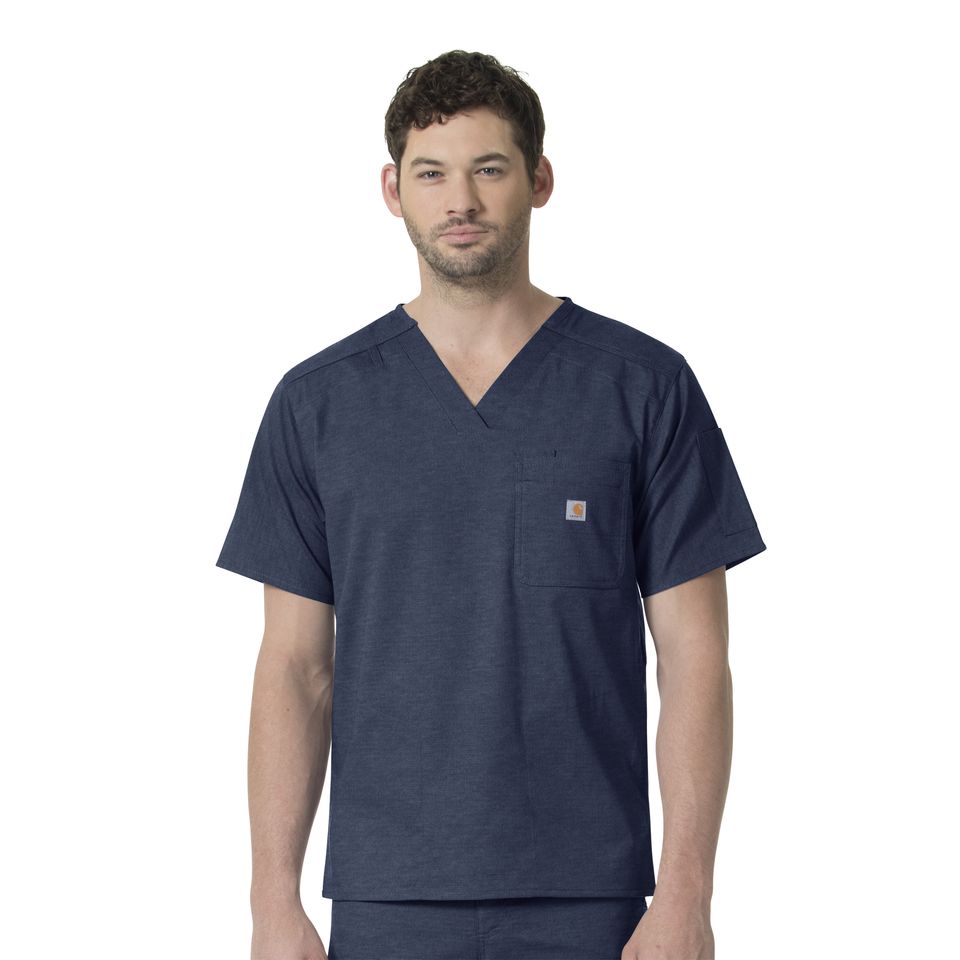 This V-neck top embodies the toughness and utility that Carhartt products are known for. Ripstop uses a special reinforcing technique that makes them resistant to tearing and ripping and Rugged Flex® uses spandex for stretch. Utility features include two lower front pocket with double left chest and left sleeve pockets. 55% Cotton/42% Polyester/3% Spandex Mens Pullover Slim V-Neck V-Neckline with triple–needle at drop shoulder, ID loop at wearers right shoulder Double chest pocket with pen slot, two side seam entry pockets, sleeve pocket Back yoke with triple-needle stitching 3 ½ inch side seam vents at bottom, 1 ½ inch longer back length Durable stretch Ripstop fabric Carhartt Mens Scrub Top V-Neck Rugged Flex C16418 Machine wash cold with like colors on gentle. Tumble dry on low. Promptly remove from dryer. Cool iron if needed. Avoid using bleach or harsh chemicals.