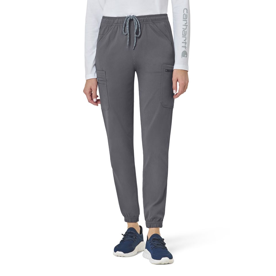 The Carhartt Women’s Rugged Flex Peak Modern Fit Cargo Jogger Pant brings a comfortable fashion style of jogger scrubs to this Carhartt medical scrubs collection. The nylon-spandex blend of fabric makes these joggers Rugged Flex approved, add to that the smart HEIQ ECO DRY technology for an eco-friendly and durable water repellency and you have a comfortable jogger pant that packs a punch. The full elastic waistband and full drawstring offer adjustable comfort and security, while the triple-needle stitching at the outseam offers additional durability and style. The multiple pockets offer organization and accessibility – two front side entry pockets with an inside pocket on the wearer’s right, two back pockets, plus two double cargo patch pockets with an accessory loop on the wearer’s right cargo and a zipper closure on the wearer’s left are all you need to keep your essentials at the ready. The bottom hem is a self-fabric enclosed elastic cuff so you have the consistency of the soft fabric against your skin with these joggers. 96% Nylon/4% Spandex Womens Drawstring Mid Rise Modern Jogger Full elastic waistband with full drawstring Two front side-entry pockets with an inside pocket on wearer's right pocket, two back pockets, two double cargo patch pockets with an accessory loop on wearer's right cargo and zipper closure on wearer's left cargo HeiQ ECO DRY technology for eco-friendly durable water repellency Self-fabric covered elastic ankle cuffs, triple-needle stitching at outseam Lightweight and durable fabric with wicking, soil release and mechanical stretch Carhartt Womens Scrub Pant Jogger Peak C52137 Machine wash cold with like colors on gentle. Tumble dry on low. Promptly remove from dryer. Cool iron if needed. Avoid using bleach or harsh chemicals.