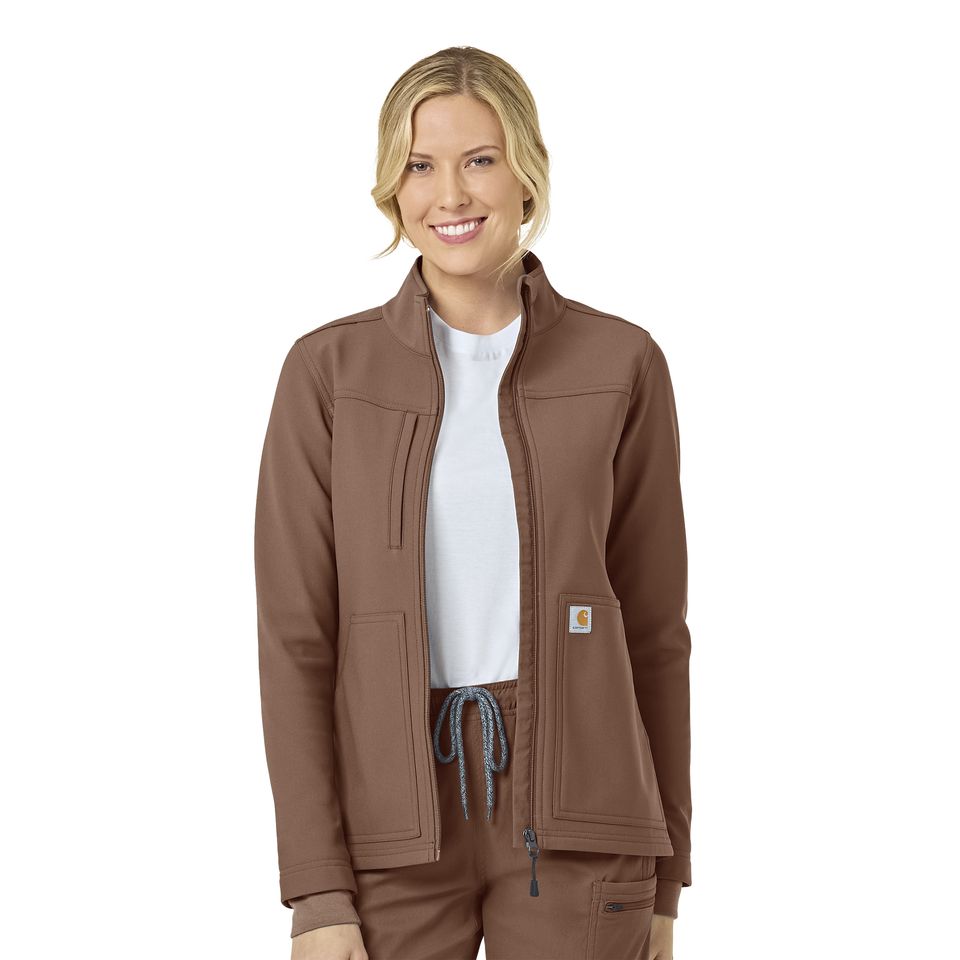 The Women’s Carhartt Medical Rugged Flex Peak Modern Fit Bonded Fleece Jacket is an ideally affordable women's jacket from a brand you can trust for all of the best technology, durable and dependable products, and a fit and comfort like no other. The two large front patch side-entry pockets, the front patch pocket on the wearers left proudly features the classic Carhartt logo, plus there is an exterior welt zip pocket on the wearers left chest for storing smaller items securely. The jacket is a full front zip with a Carhartt logo zipper pull with a chin guard at the top of the zipper for comfort. It also features ribbed sleeve cuffs so you could pull you sleeves up if needed and they would stay put. The bungee ID loop is placed smartly along the shoulder seam so that you can use it if needed, but it goes virtually unnoticed if not in use. This women's jacket has earned the Rugged Flex stamp of approval with the perfect amount of stretch, and is treated with the popular and reliable HEIQ ECO DRY technology for an eco-friendly and durable water repellency that encourages the fluid to bead up and roll off before it gets the chance to soak in. The bonded fleece is comfortable and rugged while also being fashionable. 100% Polyester Bonded Fleece Womens Zipper Modern Fleece Jacket Full zip front with chin guard at top, bungee ID loop at shoulder Large front patch side-entry pockets, zip welt exterior chest pocket HeiQ ECO DRY technology for eco-friendly durable water repellency Ribbed sleeve cuffs, embroidery friendly 100% Polyester bonded fleece Carhartt Womens Jackets/Vests Fleece Jacket Peak C81023 Machine wash cold with like colors on gentle. Tumble dry on low. Promptly remove from dryer. Cool iron if needed. Avoid using bleach or harsh chemicals.