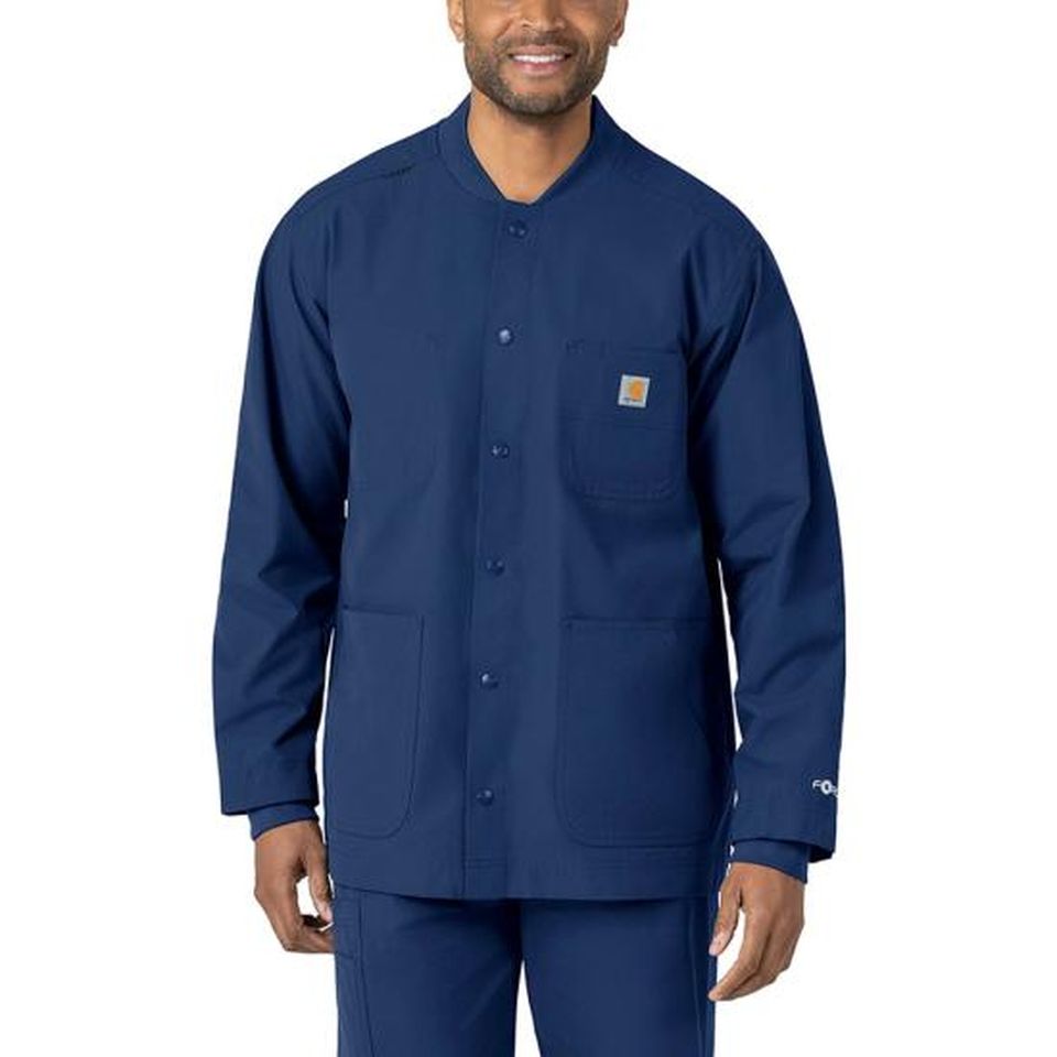 Stay comfortable as you check off every item on your workday to-do list in this Carhartt chore coat. Part of the Force Essentials collection, it's designed with technologies that help you to perform at your very best on the job. It's made of lightweight, durable fabric and cut for a modern fit that's not too tight and not too loose. Rugged Flex® stretch technology offers built-in stretch that allows you to reach the top shelf of the supply cabinet or help turn patients. Sweat-wicking and quick-drying, the coat helps you feel fresh from the beginning of your shift to the end. Stain-resistant technology keeps it looking good for seasons to come. A snap-button closure gives it a polished, professional look. Multiple functional pockets include a chest pocket with a pen slot, two top-load pockets, side entry pockets, an accessory loop inside the left pocket, and one interior full size top pocket. 50% Recycled Polyester/50% Polyester Unisex Snap Unisex Chore Coat Dyed-to-match knit fabric collar with right shoulder badge loop, snap front closure Chest pocket with pen slot, two top-load pockets, side entry pockets, accessory loop inside wearer's left pocket, one interior full size top pocket FastDry® technology keeps you cool for all day comfort, built to move with Rugged Flex® stretch technology, Stain Breaker® technology releases stains Fitted knit cuffs Lightweight, durable, sustainable and comfortable Ripstop fabric Machine wash cold with like colors on gentle. Tumble dry on low. Promptly remove from dryer. Cool iron if needed. Avoid using bleach or harsh chemicals.