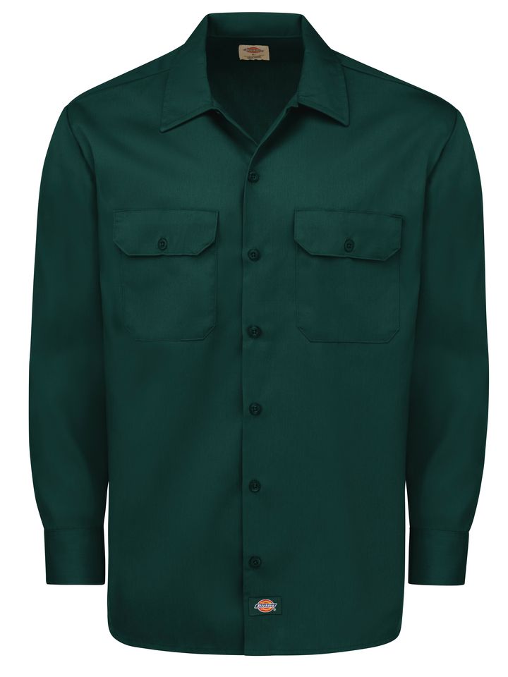 Dickies' Long Sleeve Traditional Work Shirt features a generous cut through the shoulders and chest to give you plenty of room for movement. It has a square tail design that looks good tucked in or untucked. It's crafted from our sturdy polyester/cotton twill work cloth, woven for durability and longevity. This shirt will also help you stay dry with its moisture-wicking properties. For added utility, two chest flap pockets with button closure provide storage on the job. Other details include pencil division on the left pocket, a standard spread collar and dyed-to-match melamine buttons. Body: 5.25 oz. Twill Body: 65% Polyester / 35% Cotton Non-break melamine buttons Two piece convertible collar 2 Hex chest pockets with button down flaps and pencil stall Home Wash