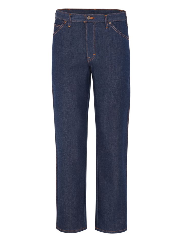 Dickies' Regular Straight Fit 5-Pocket Denim Jean is a work pant built of 100% heavyweight cotton denim twill with traditional 5-pocket styling. It has everything you want in a pair of hardworking jeans. Sits slightly below the waist, fits over boots, has a heavy-duty brass zipper and rivets at stress points. It is engineered to last and priced to please. Body: 14 oz. Denim Body: 100% Cotton Metal tack buttons Deep front and back pockets|Coin pocket is big enough to hold a small pocket knife|Signature stitching on back pockets Folder set, 1.5" Home Wash