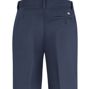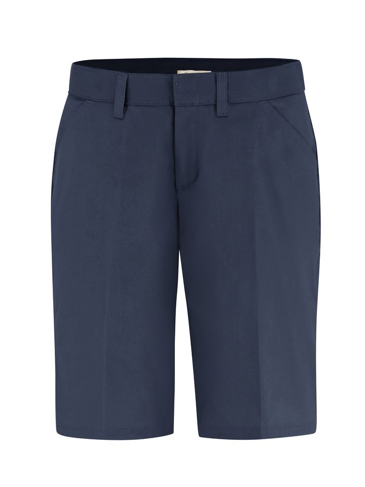 Dickies' Women's 10" Relaxed Fit Flat Front Short sits slightly below the waist and has a stretch interlining in the waistband for expanded comfort in the waist. It features wrinkle resistant, StayDark® and stain release technology. The short is made with two front pockets and a right back-welt pocket for utility. Body: 6.75 oz. Stay Dark® Twill Body: 65% Polyester / 35% Cotton Metal hook and eye 4 Right back welt pocket with button closure |Slash front pockets Folder set, 1.5", Stretch interlining for expanded comfort waist Industrial Laundry - Heavy Soil
