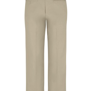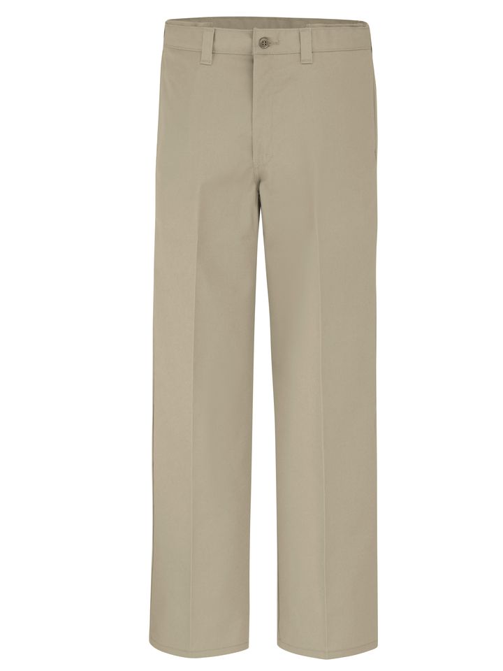 Dickies' Industrial Flat Front Comfort Waist Pants stand apart from the competition by utilizing a hidden, expandable, comfort waistband instead of the traditional gathered elastic waistband. This unique waistband not only provides added comfort for the wearer but reduces costly size exchanges for the industrial laundries. It also boasts features not found on competitor pants. Features like Stay Dark® fabric, wider-stronger belt loops, and deep front pockets, making this pant the ultimate in comfort and durability. Body: 7.75 oz. Stay Dark® Twill Body: 65% Polyester / 35% Cotton Button 4 Reinforced front pockets. Welt back pocket. Folder set, 1.5" with a comfort waistband Industrial Laundry - Heavy Soil