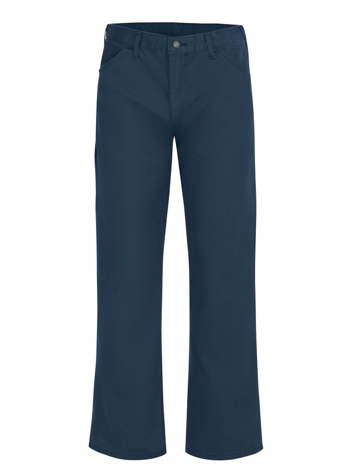 Dickies' workwear steals the spotlight with this Industrial Relaxed Fit Straight Leg Carpenter Duck Jean. Made for the toughest jobs, the duck fabric will stand up to any job. Either color you choose will stay vibrant with a fade resistant technology that stands up to industrial laundering. On top of that, this is garment washed for softness and shrinkage control. Body: 10 oz. Stay Dark® Duck Body: 75% Cotton / 25% Polyester Metal tack button 5 Front scoop pockets with watch pocket. Oversized back pockets. Folder set, 1.5" Industrial Laundry - Heavy Soil