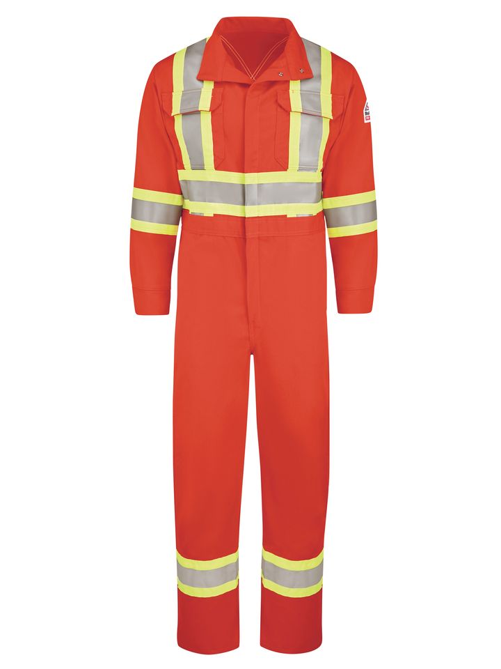 This premium coverall provides CAT 2 protection plus the addition of 4" reflective trim for low visibility environments. Includes Mandarin-style, stand-up, two-way safety collar, concealed snap closure on cuff, side vents and pockets in just the right places offer extra comfort, convenience and mobility while you work. Body: 9 oz. Excel FR® ComforTouch® Flame Resistant, Hi-Visibility Twill Body: 88% Cotton / 12% Nylon Arc Rating ATPV 12 calories/cm² NFPA 2112|NFPA 70E|CSA-Z96 Category 2 Protection|CSA Z96 Class 3 Level 2|Meets ASTM F1506 Two-way, concealed Nomex® taped brass break-away zipper, concealed snap at top of zipper and at neck Two front swing pockets, two patch chest pockets with flaps and concealed snap closure, two patch hip pockets, left sleeve tool pocket, rule pocket Industrial Laundry - Light Soil