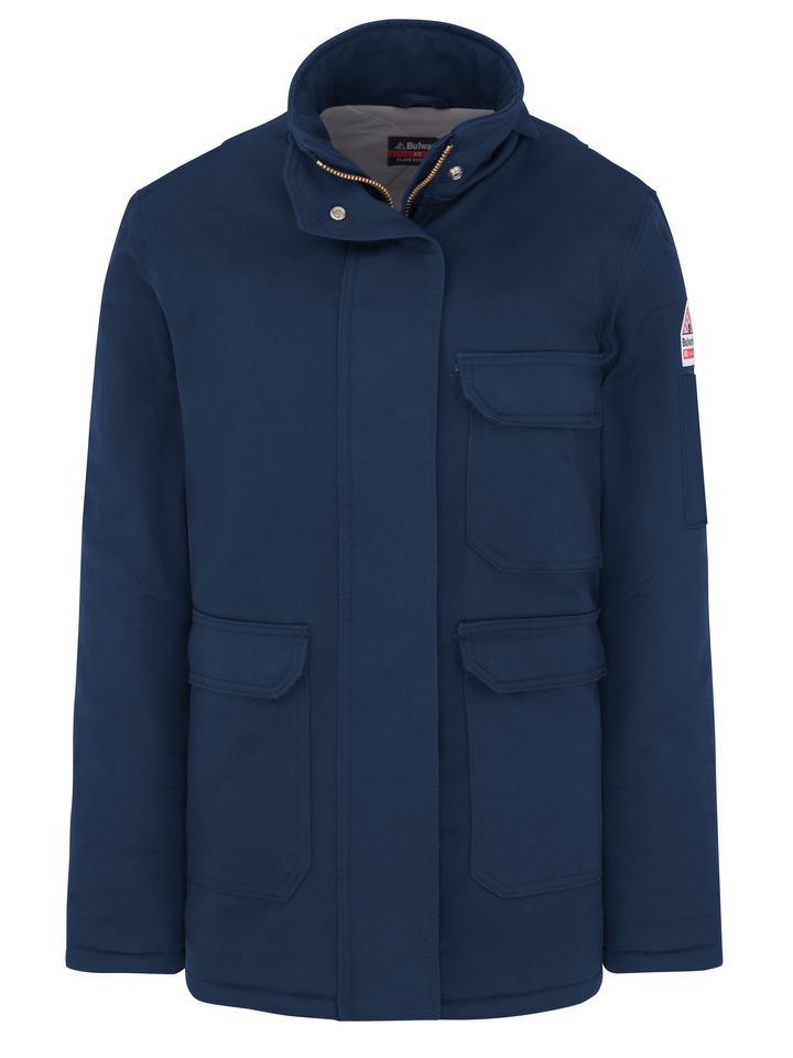 This women's heavyweight CAT 3 AR/FR parka is insulated to provide warmth and FR protection without excess weight. Plus, water-repellent fabric keeps you dry in wet weather, while elastic inserts at waist across back allow for greater mobility. Shell: Westex Ultrasoft® Flame resistant, 7 oz. (235 g/m²) Twill, Water-Repellent|Insulation Package: 12 oz. (405 g/m²) Shell: 88% Cotton/ 12% Nylon|Lining: 100% Cotton|Insulation Package: 100% Modacrylic Arc Rating ATPV 34 calories/cm² Two-way, separating, heavy-duty Nomex®, taped brass zipper, fully covered with insulated storm flap, concealed snap closure Fully insulated stand-up collar Three large patch pockets with concealed snaps (lower pocket with handwarmers), one inside chest pocket& sleeve pocket Industrial Laundry - Heavy Soil|Industrial Laundry - Light Soil|Home Wash