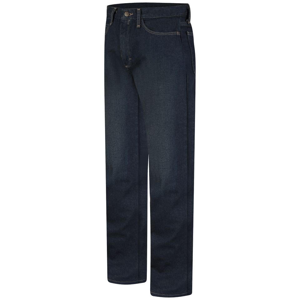 This CAT 2 AR/FR denim jean offers a classic workwear look and fit with FR protection and five-pocket jean styling. Straight fit sits just below the natural waist and has a straight thigh and leg opening for a tailored look that fits snuggly over boots. EXCEL FR® Flame resistant, 12.5 oz. (425 g/m²) 100% Pre-Washed Cotton Denim Arc Rating ATPV 18 calories/cm² One-piece waistband with metal button closure (metal is not exposed to the skin) Five jean-style pockets Industrial Laundry - Heavy Soil|Industrial Laundry - Light Soil|Home Wash