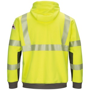 This color block hooded sweatshirt features updated styling to keep you warm when the days turn chilly. This FR hi-visibility pullover is made for warmth, comfort, and work. It features iQ Series® Endurance rip stop twill reinforcement on interiors of sleeves to increase durability. The sweatshirt is waffle lined for extra warmth, has a large hand pocket and a 3-piece hood with drawstring closure. This will quickly become your go-to sweatshirt for warmth and protection. Fabric: Flame-resistant 12.30 oz. (349 g/m²)|Lining: Waffle 7.60 oz. (215 g/m²)Body: 12.3 oz. Flame Resistant Fabric: 48% MODACRYLIC/38% LYOCELL/10% PARA ARAMID/4% SPANDEX|Lining: 100% COTTON THERMAL WAFFLE KNITBody: 48% Modacrylic / 38% Lyocell / 10% Para-aramid / 4% Spandex Elastane Arc Rating ATPV 45 calories/cm² ASTM F1506|NFPA 2112|NFPA 70E Category 4 Protection|ANSI 107 Type R Class 3 Three piece hood with drawstring closure Large hand warmer pocket, concealed utility pocket inside front pocket Home Wash